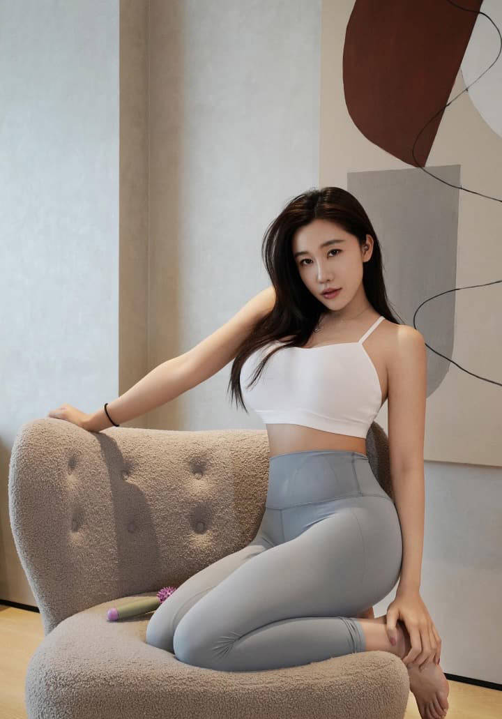 在这组写真中,一只77坐在米色绒面椅上,身穿白色简约吊带运动上衣,搭配高腰浅灰色紧身瑜伽裤。她的穿搭风格充满运动感与现代气质,服装紧贴身形,突出了她健康而柔美的曲线。长发披肩,神态自然,背景是简约艺术风格的墙面装饰与浅色木地板,整张照片充满清新、明快的生活气息,展现出她力量与柔美并存的独特魅力。